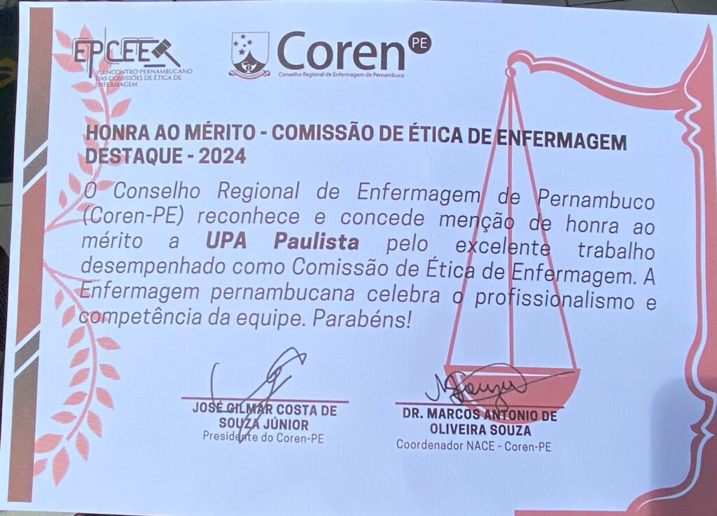 A UPA Paulista, unidade da Rede Estadual de Saúde gerenciada pela Fundação Manoel da Silva Almeida / Hospital Maria Lucinda, foi reconhecida pelo Conselho Regional de Enfermagem de Pernambuco (Coren-PE) com a menção de honra ao mérito pelo trabalho desenvolvido por sua Comissão de Ética de Enfermagem, referente ao ano de 2024. Esta é mais uma homenagem para a unidade que destaca o compromisso da equipe com a ética profissional, a qualidade da assistência e o cuidado humanizado à população.